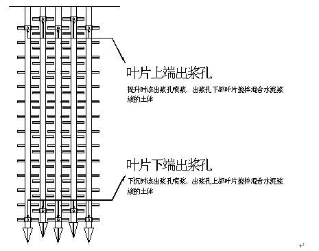 五軸深層攪拌樁是近年來基坑圍護領域出現、推廣的一種新工藝,其設計思想起源于雙軸攪拌樁和三軸攪拌樁,但五軸攪拌樁在安全、質量、進度、經濟性等方面均領先于原有工藝。五軸攪拌樁是一種五根鉆桿同時攪拌水泥土成樁工藝,每根鉆桿下部安裝有12層葉片,并在葉片上、下端分別開有出漿孔。攪拌下沉時葉片下端出漿孔噴漿、攪拌提升時葉片上端出漿孔噴漿,且攪拌下沉、提升時五根鉆桿同時噴漿,即“兩噴兩攪”工藝(如圖示1)。
