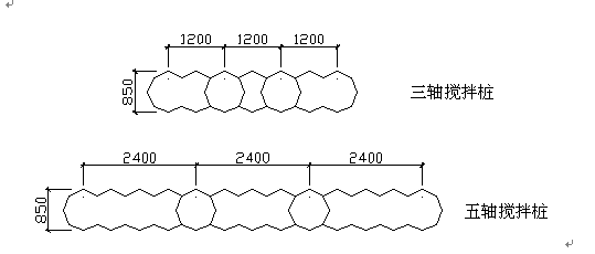 五軸攪拌樁采用多層葉片攪拌土體、五根鉆桿同時噴漿且上、下交替噴漿工藝,使同一層面混合了水泥漿液土體被攪拌次數增多,保證了成樁質量。采用套接一孔方式施工可以有效防止樁體下部開叉。